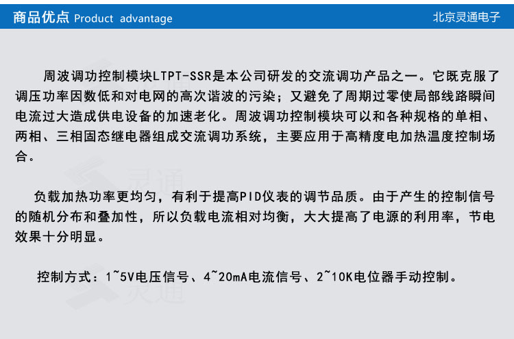 • 產(chǎn)品描述:周波數(shù)調(diào)功控制模塊LTPT-SSR是本公司研發(fā)的交流調(diào)功產(chǎn)品之一。它即克服了調(diào)壓功率因數(shù)低,對(duì)電網(wǎng)的高次諧波的污染,又避免了周期過零使局部線路瞬間電流過大造成供電設(shè)備的加速老化。 周波數(shù)調(diào)功控制模塊可以和各種規(guī)格的單相、兩相、三相固態(tài)繼電器組成交流調(diào)功系統(tǒng),主要應(yīng)用于高精度電加熱溫度控制場(chǎng)合,負(fù)載加熱功率更均勻。